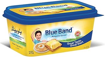 Blue Band butter is a brand of processed butter and margarine commonly used for cooking, baking, and spreading. It is made from vegetable oils and/or dairy, and is designed to have a creamy texture and rich flavor. It is widely used in households as a convenient source of fat.